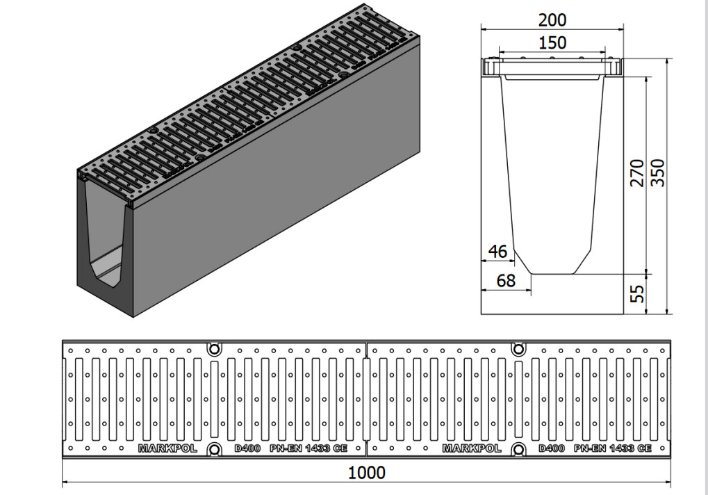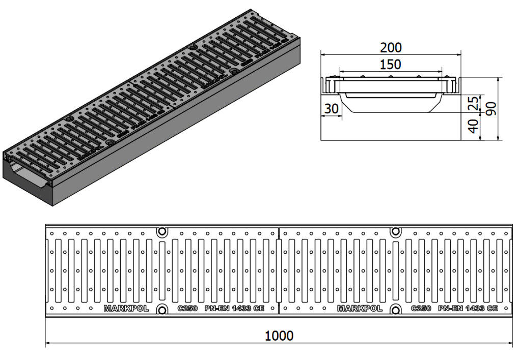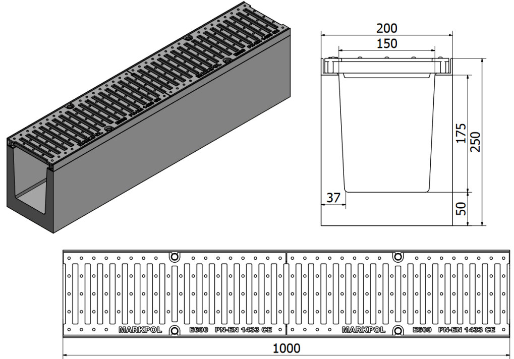 Kanał B125: Spód kanału: korytko z betonu C30/C45 klasy C250 ze stalowym okuciem krawędzi, zbrojone Prętami fi 8 Sposób mocowania: kratki przykręcane śrubami M8 z łbem krzyżakowym , do zainstalowanych nitonakretek w okuciu kanału. Ruszt: krata stalowa ocynkowana Zbrojenie: listwy wsporcze wykonane z profili stalowych gorącowalcowanych, połączone ze sobą zbrojeniem zrobionym ze strzemion stalowych, obudowanych prętami żebrowanymi Fi 6, całość zatopiona w betonie C35-45 tworząc żelbet o bardzo wysokiej wytrzymałości. PN-EN 1433:2005:B125 |